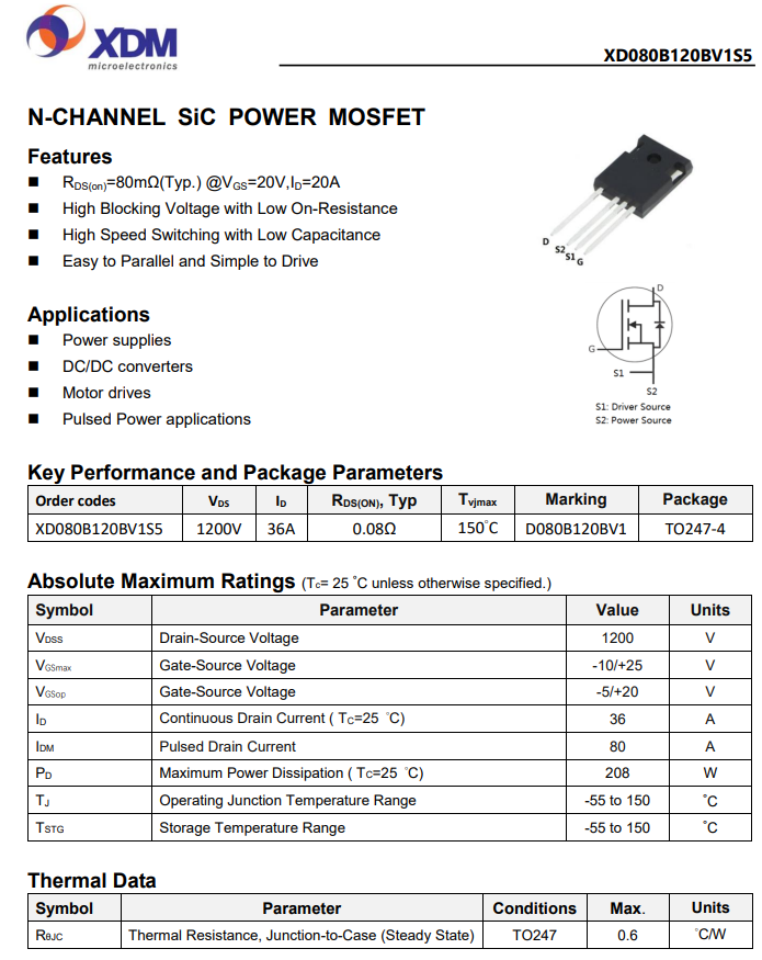 XD080B120BV1S5 80mohm 1200V TO-247 4L 電源(UPS/移動儲能/光伏逆變)