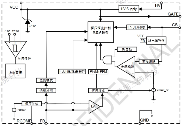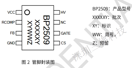 ?BP2509芯片定位?:一款高性能電流模式PWM控制器,支持寬輸入電壓(8V-450V),內置高壓啟動電路,適用于Buck、Buck-Boost等非隔離拓撲。內部框架圖如下所示