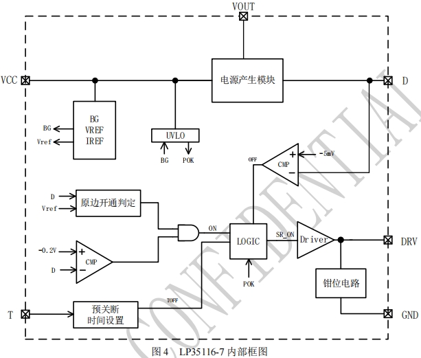 在電氣參數方面,LP35116-7 表現卓越。其 VCC 工作電壓范圍為 5.8V 至 6.4V,啟動電壓為 4.3V 至 4.7V,欠壓保護閾值為 3.8V 至 4.2V。整流管的開通電壓閾值為 -0.25V 至 -0.15V,關斷閾值為 -8mV 至 -2mV。驅動能力方面,其驅動電壓最大值為 6V,驅動腳出電流典型值為 1.5A,入電流典型值為 4A,上升時間為 25ns,下降時間為 10ns。這些參數確保了芯片在高效率和快速響應之間的良好平衡。