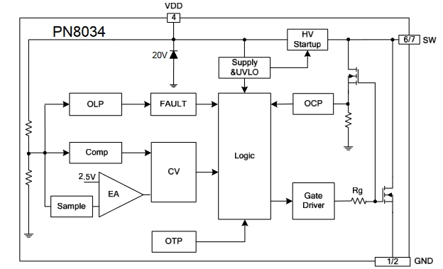 PN8034內置高壓啟動模塊,能夠實現系統快速啟動和超低待機功耗,待機功耗低于100mW。