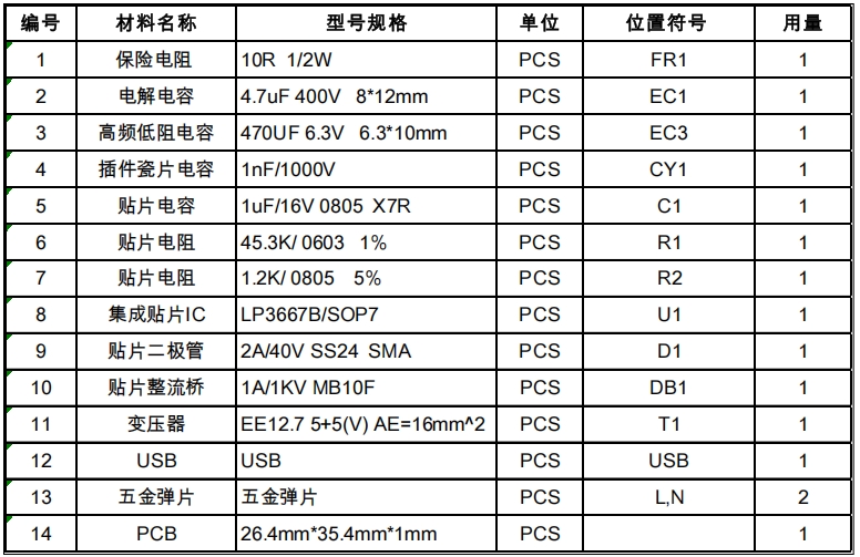 物料清單是實現(xiàn)電路設計的基礎(chǔ),它詳細列出了電路中所使用的各種元件及其規(guī)格型號。在 LP3667B 5V1A 充電器的 BOM 表中,涵蓋了保險電阻、電解電容、高頻低阻電容、瓷片電容、貼片電阻、集成貼片 IC、貼片二極管、貼片整流橋、變壓器、USB 接口、五金彈片以及 PCB 等多種元件。例如,保險電阻采用 10R 1/2W 的規(guī)格,用于電路的過流保護;電解電容選用 4.7uF 400V 的型號,用于輸入濾波;高頻低阻電容則采用 470uF 6.3V 的規(guī)格,用于輸出濾波,以降低輸出紋波。這些元件的合理選型和搭配,共同構(gòu)成了一個高效、穩(wěn)定的充電器電路。