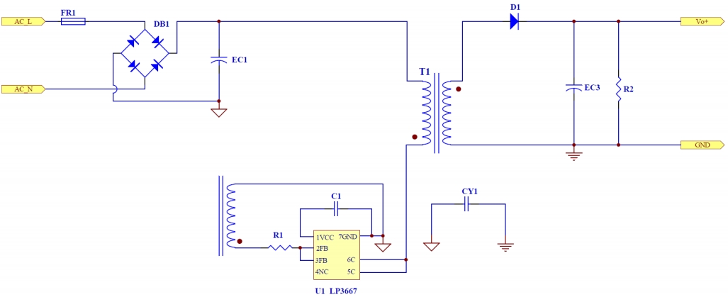 充電器的電路設計是其核心部分,其電路圖展示了各個元件的連接關(guān)系和功能。從電路圖中可以看出,該設計采用了典型的開關(guān)電源架構(gòu),主要包括輸入整流濾波電路、主控芯片 LP3667B、變壓器 T1、輸出整流濾波電路以及保護電路等關(guān)鍵部分。輸入整流濾波電路將交流輸入轉(zhuǎn)換為直流,并通過濾波電容去除高頻噪聲,為后續(xù)電路提供穩(wěn)定的直流輸入。主控芯片 LP3667B 作為整個充電器的“大腦”,負責控制開關(guān)頻率、占空比以及實現(xiàn)各種保護功能,確保充電過程的安全與高效。變壓器 T1 是實現(xiàn)電壓轉(zhuǎn)換和電氣隔離的關(guān)鍵元件,其三繞組結(jié)構(gòu)能夠有效降低電磁干擾并提高轉(zhuǎn)換效率。輸出整流濾波電路則將變壓器次級輸出的高頻脈沖轉(zhuǎn)換為穩(wěn)定的直流輸出,并通過濾波電容去除輸出紋波,保證輸出電壓的純凈度。