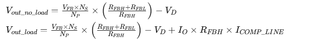 其中,RFBH 是 FB 外接的上偏電阻,RFBL 是 FB 外接的下偏電阻,ICOMP_LINE 是滿載經(jīng)過 FB 上偏電阻的輸出線補(bǔ)償電流,Nf 是輔助繞組匝數(shù),VFB 是基準(zhǔn)電壓(典型值 1.0V),VD 為輸出續(xù)流管壓降,IO 為帶載電流,IOCP 為輸出恒流電流。