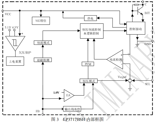 LP3717BSH 通過外置電阻,可調(diào)原邊峰值電流,再通過變壓器原副邊匝比來設(shè)置輸出恒流點(diǎn);通過設(shè)定 FB 上偏電阻和下偏電阻來設(shè)置輸出恒壓點(diǎn)。為了實(shí)現(xiàn)系統(tǒng)成本的極致簡化,LP3717BSH 內(nèi)置啟動(dòng)電路,外圍不需要啟動(dòng)電阻;采用自供電的方式來取消輔助繞組 VCC 供電二極管。