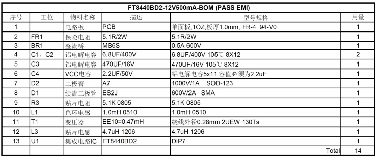 以下是FT8440BD2方案的物料清單,包括了電路板、保險(xiǎn)電阻、整流橋、鋁電解電容、貼片電容、二極管、貼片電阻、色環(huán)電感、變壓器、貼片電感和集成電路IC等元件。這些元件均為高品質(zhì)的常用元件,易于采購且成本較低。