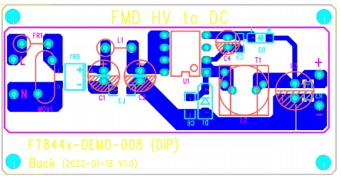 PCB布局對(duì)于電源性能至關(guān)重要,F(xiàn)T8440BD2方案采用了單面板雙面元件的設(shè)計(jì),PCB厚度為1mm。PCB頂面為插件元件,底面為貼片元件。這種布局方式不僅節(jié)省空間,而且便于生產(chǎn)和維護(hù)。