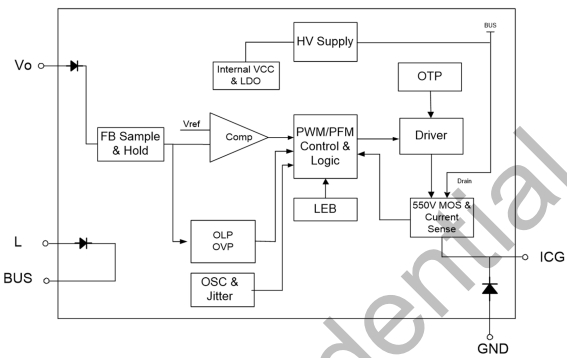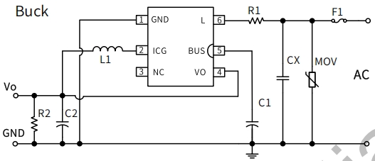 ICG(管腳 2):芯片地,同時也是內(nèi)置 MOSFET 的源極和內(nèi)置續(xù)流二極管的陰極。該管腳為芯片的內(nèi)部控制電路提供了接地參考點,并確保 MOSFET 能夠正常導通和關斷。