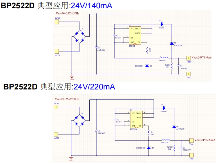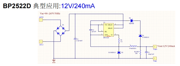 以BP2522D為例,持續輸出240mA,脈沖350mA,電感量為470uH,電感電流紋波為57mA。最大峰值電流為579mA,BP2522D內部MOS管限制最大電流為750mA,留有一定余量,可取Rcs=0.3ohm。