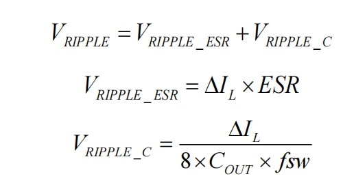 輸出電容的選擇對輸出電壓紋波、系統動態響應、環路穩定性、輸出電壓過沖等有直接影響。在恒定輸出電流的CV模式下,輸出紋波主要由輸出電容的等效串聯電阻(ESR)和容量決定。紋波計算公式為: