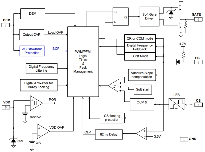 全面的保護(hù)功能:包括欠壓保護(hù)、過壓保護(hù)、逐周期電流限制、過載保護(hù)等,確保電源系統(tǒng)在各種異常情況下都能安全運行。