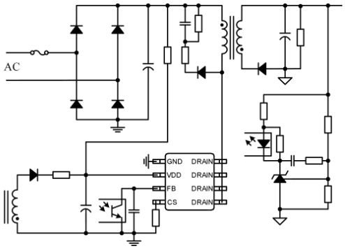 芯片通過對輸出采樣并反饋到光耦獲得高精度的恒壓輸出。內置的斜率補償電路確保了峰值電流模控制的穩定性。內部集成的頻率抖動功能可以改善EMC,降低EMI濾波成本。